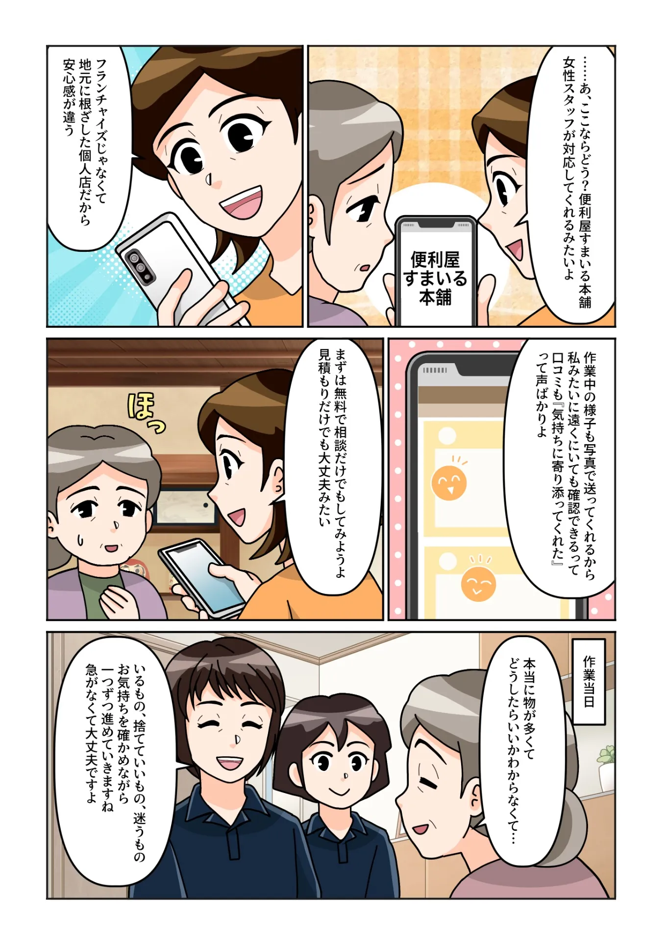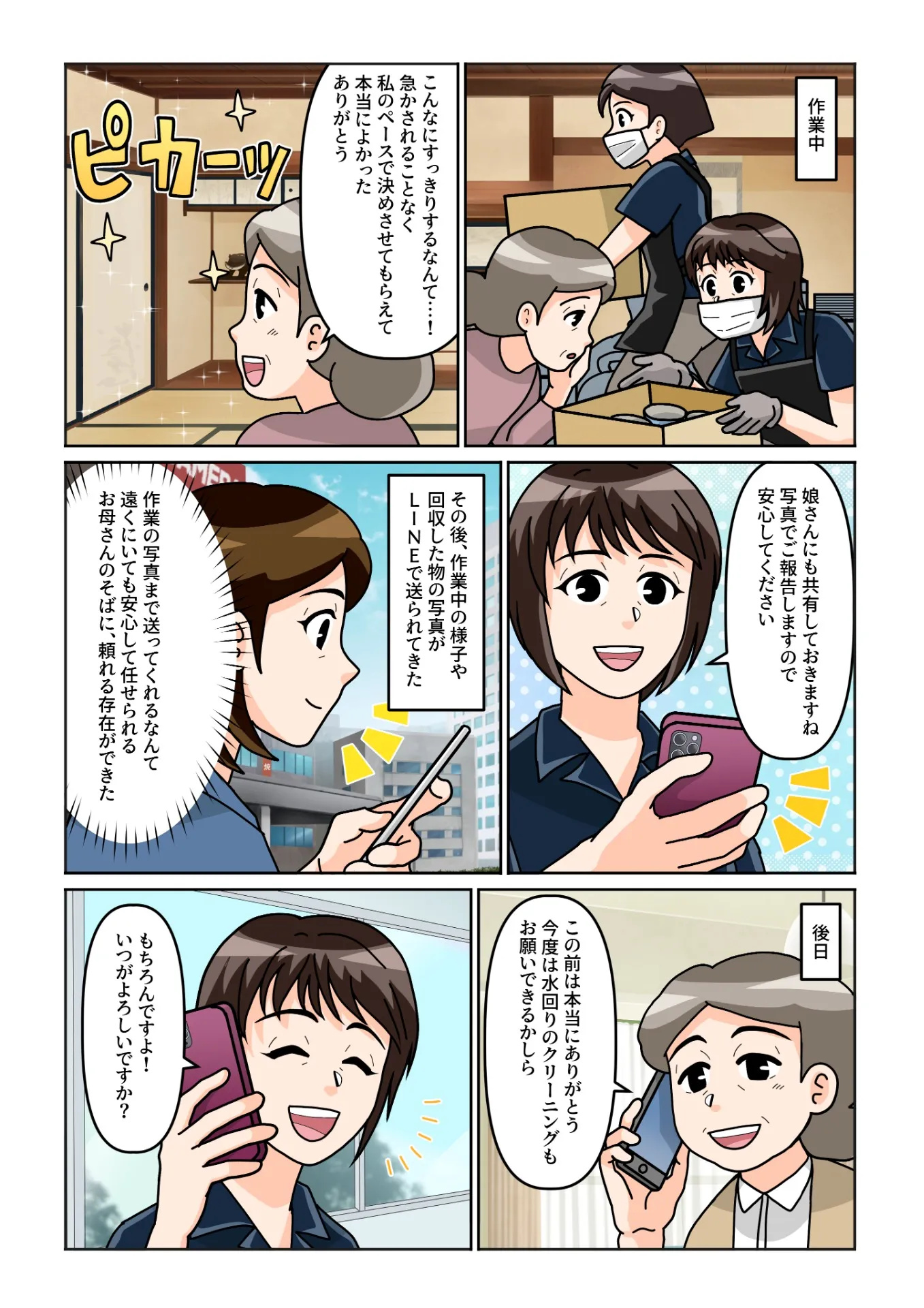 主人公「作業中の様子も写真で送ってくれるから、私みたいに遠くにいても確認できるって。口コミも『気持ちに寄り添ってくれた』って声ばかりよ」